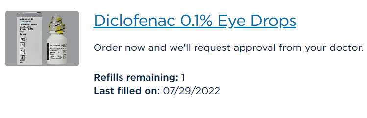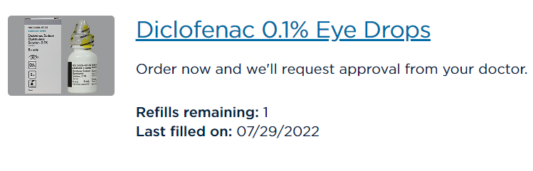 What is this “good stuff”? It’s a solution of diclofenac sodium (generic name). You can read more about the ophthalmic use of diclofenac on the Mayo Clinic’s website. In this liquid form, it is currently available only by prescription.