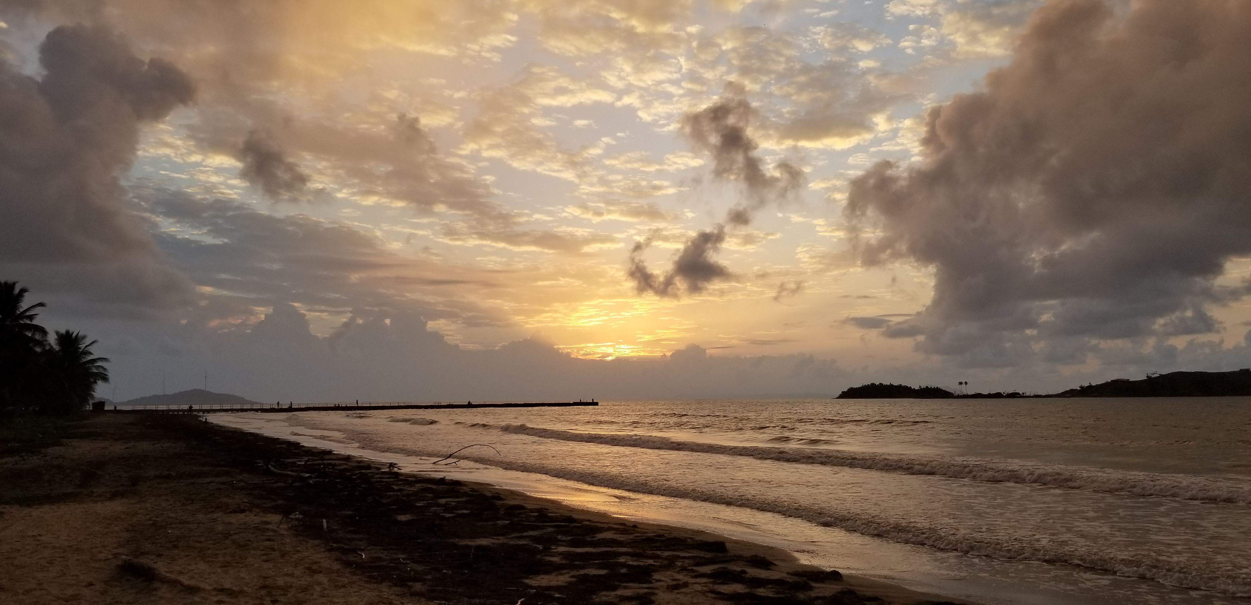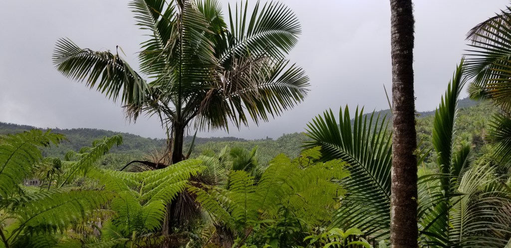 Clearly, I had given into my greed almost completely. I had booked an AirBnB for that night on in Punta Santiago on the southeastern coast near Humacao, but the rains in the highlands meant that I could not comfortably stay on La Ruta Panoramica, much less make it to my lodging before midnight. So you can see that I cut south again towards Villalba and the coast. At that point, my screenshots of my planned route were useless and I had no wi-fi. But I did have a little 8”x24” foldable paper map that I had picked up in the airport, and it served me well enough. (And I have it still!) Even moving at 85 kph, the southern coast struck me as very different. The north had big population centers and industrial areas. The south was less populated, and much of it was put to agricultural use. Plaintain orchards and other cropland stood out, and there were also unfarmed grasslands and wooded areas on either side of the road. I had an unforgettable 30 seconds when a kilometer ahead of me a galloping white horse emerged from the woods 50 feet to the south of the road, continuing on into the grass on that side before crossing and disappearing on the north. As my eyes returned to the road before me four other horses at shorter intervals followed their leader into the plantain rows on the north side. Good thing there was no rider on that pale horse!