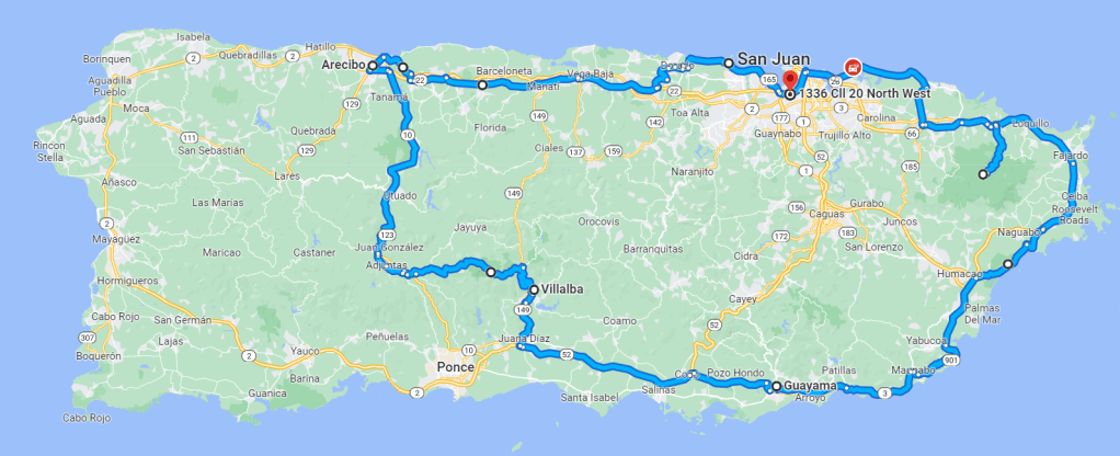 I settled on the route you see below. Lots of the northern coast, from San Juan west to Arecibo some of that stretch was on narrow two-lanes where tides had washed sand onto the road surface. Some of it was a mix of fine multi-lane expressways; divided highways, county roads and urban streets in various configurations and states of repair. From Arecibo south to Adjuntas, what began as divided highway narrowed as the road got further away from population centers and higher. Turning east from Adjuntas, I joined a section of La Ruta Panoramica. In several segments the road was throttled down to one lane due to washouts from flooding. Semis travel the high roads, too, but they make ‘hairpin’ turns that are more like an open parenthesis / ( / than a nice tight / c /. I didn’t want me and the motorcycle to be dashed against the parenthesis / (- / when coming into a blind curve too swiftly. That’s not the best way to come to a full stop. Period.