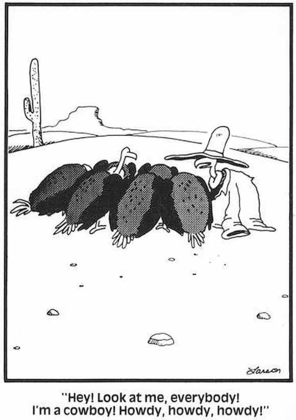 Managing farmland does not make me a farmer, not any more than wearing a ten-gallon hat would make me a cowboy. Nope, no matter how much a guy might want to be one, the hat doesn’t make the cowboy, as Gary Larson hilariously shows in The Far Side panel that’s always been a favorite of mine.
