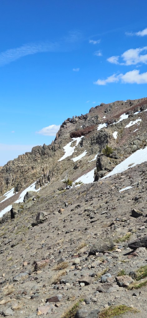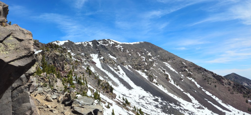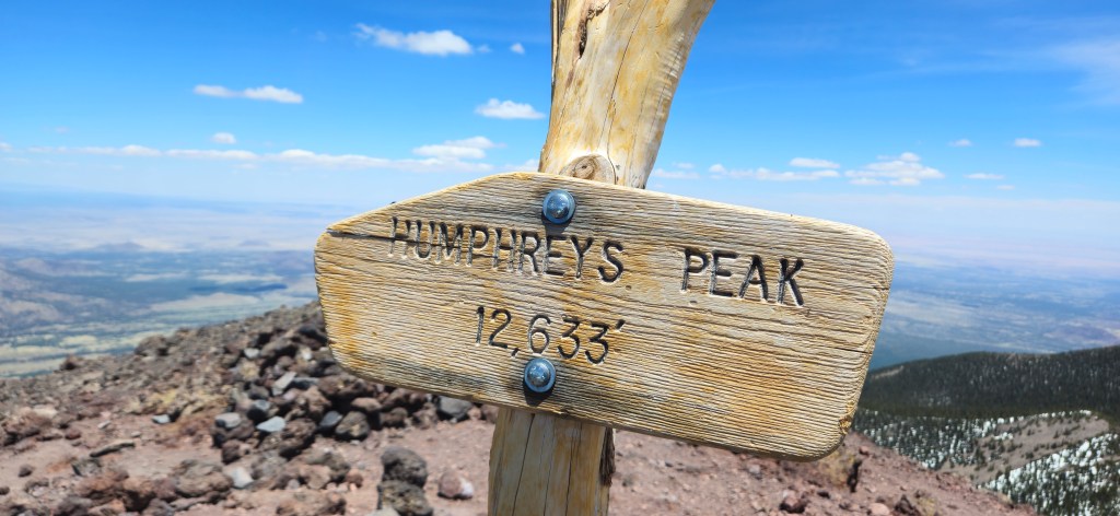 Back to my trip, the sustained peek I had at these mountains as I drove past them stuck in my mind. At intervals on the rest of my drive to California and idle moments there, I read up on the mountains, particularly the tallest peak, Humphrey’s. And the maturation of the wheat in Kansas slowed down enough for me to plan on making Humphrey’s my “sneak peak,” my unanticipated first summit of 2024. Humphrey’s has a pretty well-defined trail up it (“strenuous”, roughly 10 miles, with a 3,420-ft. gain in elevation, according to the Forest Service). Trip reports on hiking apps relayed that much of the winter’s snow had melted, leaving fields which were passable, especially if one wore microspikes for additional traction.