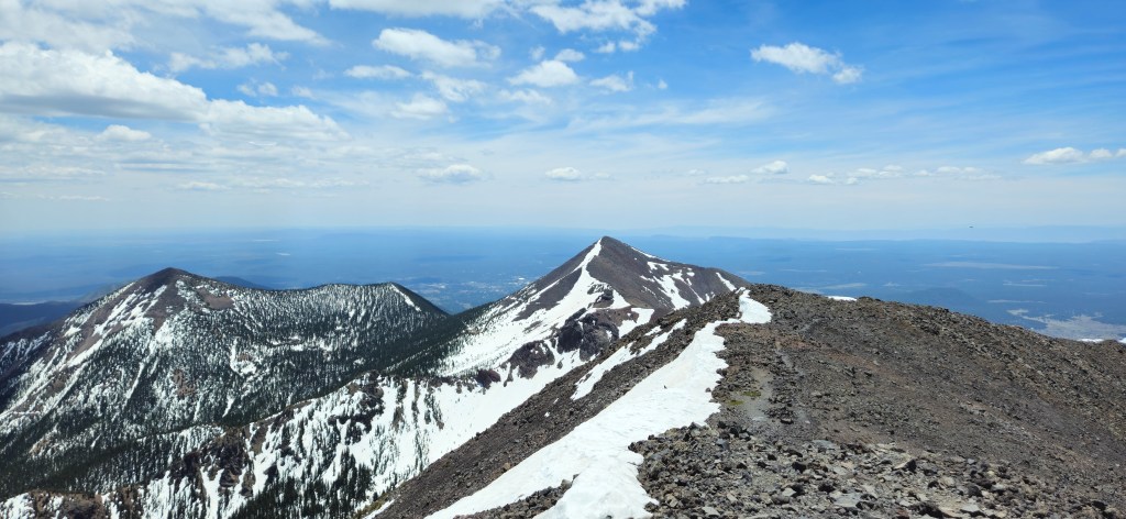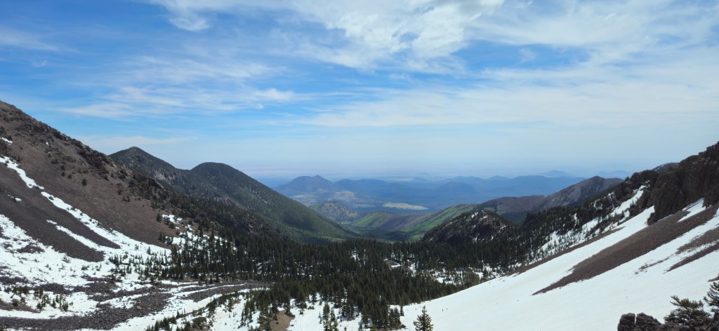 It was good that I did, as the snow fields were numerous and thick, spread over more than two miles on sections of the trail well-shaded by trees. The fields were usually off-camber, regularly steep on ascent and descent, and often on portions of the trail where there was a stark downhill slope. The spikes were for me essential, and though I was far slower than I hoped, I made it to the top and back down with only minor slips and slides. It gave me some comfort to know that the snow I fell into was natural (if not pristine), as the reclaimed wastewater sprayed in Snowbowl’s artificial snow operations is over on the slopes of Agassiz Peak. I took more comfort (and my sore joints needed it!) from the landscape and its amazing views, and from the sense of accomplishment.