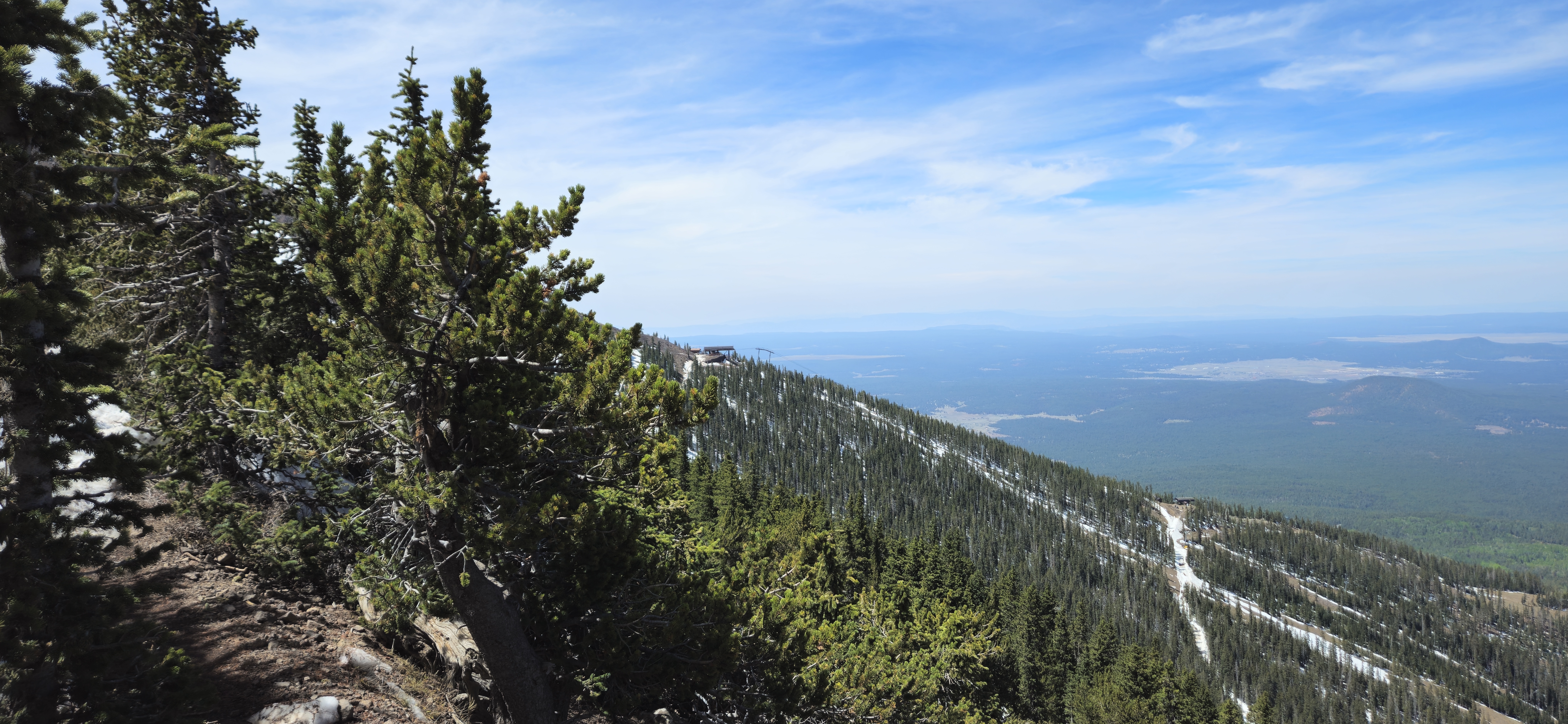 It was good that I did, as the snow fields were numerous and thick, spread over more than two miles on sections of the trail well-shaded by trees. The fields were usually off-camber, regularly steep on ascent and descent, and often on portions of the trail where there was a stark downhill slope. The spikes were for me essential, and though I was far slower than I hoped, I made it to the top and back down with only minor slips and slides. It gave me some comfort to know that the snow I fell into was natural (if not pristine), as the reclaimed wastewater sprayed in Snowbowl’s artificial snow operations is over on the slopes of Agassiz Peak. I took more comfort (and my sore joints needed it!) from the landscape and its amazing views, and from the sense of accomplishment.